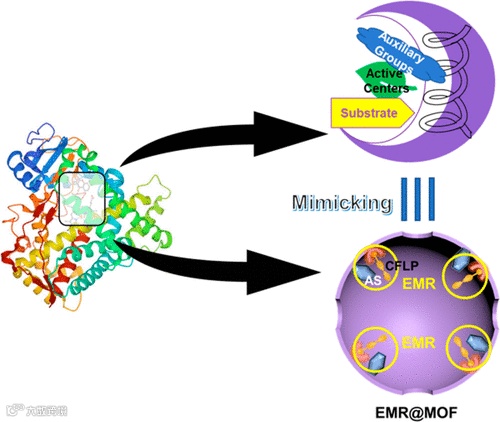 金属有机骨架化合物(metal-organic framework, MOF)是由金属离子和有机配体通过配位作用自限制组装形成的多孔晶体化合物。具有组成结构可调,孔道大小、结构和环境可控等优势,被认为是新一代异相催化剂的代表之一,特别是其在多功能性方面的可设计性使它在选择性催化应用具有巨大潜力。例如,一系列手性MOF就被用于多种反应中,并被证实是具有良好对映体选择性的催化剂,但它们被研究用于调控多选择性的例子依然很少。本课题组在前期深厚的研究经验积累下,在该项目中提出在非手性MOF的纳米尺度空间中构建一个个拟酶活性区域,这些单个区域具有活性位点和可以对它施加手性诱导和次级相互作用的功能基团/环境,这样每个区域都可以像酶一样控制反应过程中的多种选择性(图一)。无数活性区域分布在MOF限域孔道中,增加了活性位点密度且增强了手性诱导环境,可以期待按照这种设计思路制备的催化剂实现高效选择性催化。