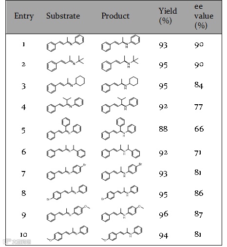 由于手性路易斯酸碱对(CFLP4)目前仍然处于研究初期,我们设计了四种不同的组合酸碱对,通过理论计算来指导它们加氢活性的判断。实验结果与理论计算一致,CFLP4-0.75@MIL-101(Cr)显示出最好的催化效果,通过对不同α,β不饱和亚胺进行对映体和化学选择性加氢可以合成多种手性β不饱和胺,产率在90%左右,对映体过量值为66%-90%之间(表一)。此外,催化剂显示出良好的可再生性/重复使用性。