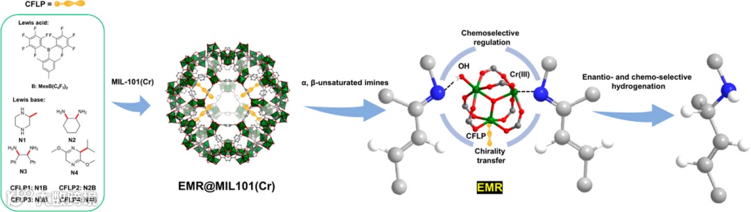 活化后的MIL-101(Cr),有重复的Cr3(μ3-O)(COO)6(OH)二级组成单元,每个单元具有两个开放Cr金属位点,和一个羟基。按照设计思路来制备催化剂,把具有加氢活性的手性受阻路易斯酸碱对锚定在二级单元的一个Cr位点,剩余的金属位点和羟基可作为施加次层作用的功能基团,共同完成目标选择性加氢(图二)。