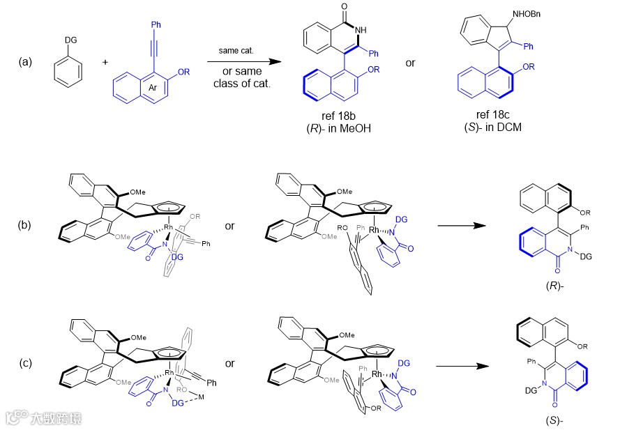 , 16628–16633.) 发现,反应溶剂的精准调控可以实现两个轴手性非对映异构体高效合成(图3)。炔烃插入的立体化学与反应溶剂的性质密切相关。在非质子溶剂中,Ag(I)或Zn(II)等Lewis酸添加剂与底物的导向基团以及大位阻炔的2-OR基团相互作用,从而影响大位阻炔的插入立体选择性。