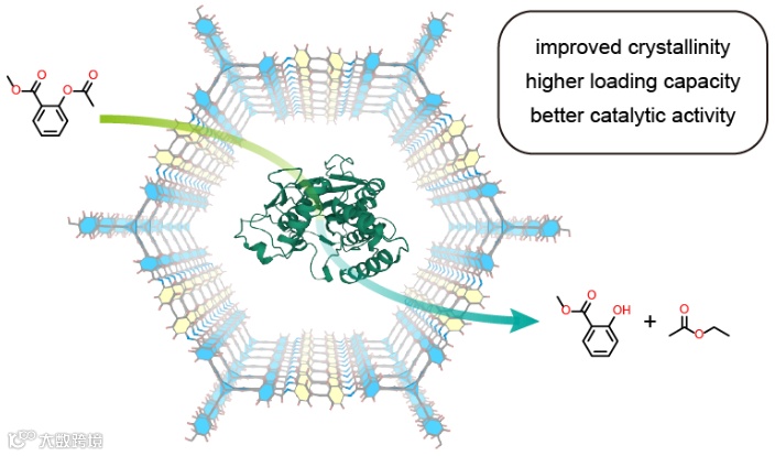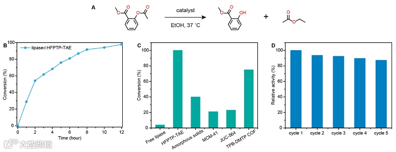 图1. Lipase⊂COF HFPTP-TAE复合催化剂用于乙酰水杨酸甲酯醇解反应示意图
