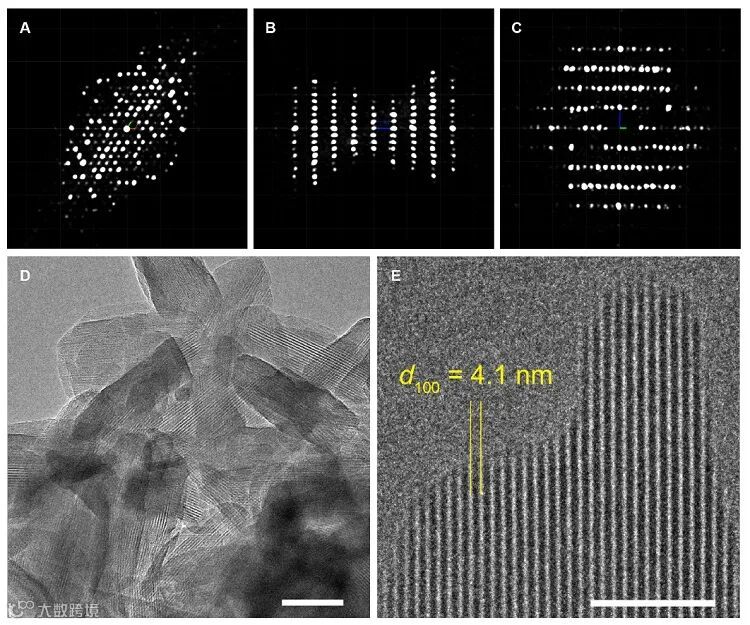图2. COF HFPTP-TAE三维电子衍射画面及高分辨透射电镜照片