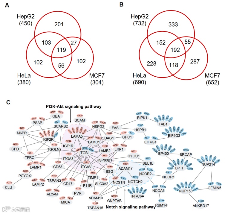 最后,研究者利用新建立的富集策略,对三种肿瘤细胞系的糖蛋白组学进行研究,结果显示核心岩藻糖基化蛋白主要与细胞表面和细胞外基质的功能相关,
