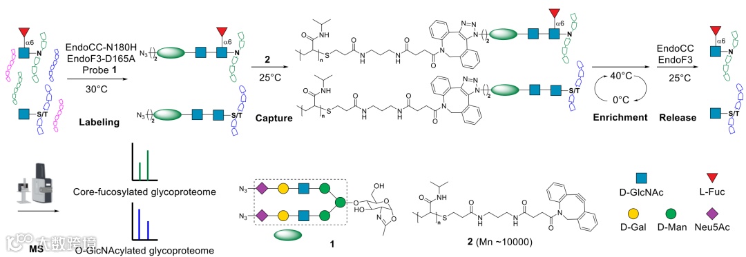 导读:近日,中国科学院上海药物研究所的文留青研究员团队和周虎研究员团队利用特异性识别核心岩藻糖基化和O-GlcNAc糖基化的酶、叠氮化探针分子和功能化温度敏感的富集材料,实现了两种糖基化位点的同步精准解析。