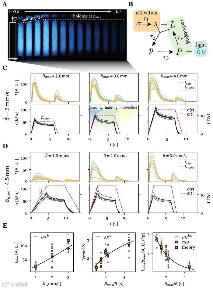 作为模型输入信号,成功拟合了发光强度,并且与实验相比取得了良好的一致性(图5C和D)。这一定量化的数学模型可以为该活性材料的力学传感应用打下基础。