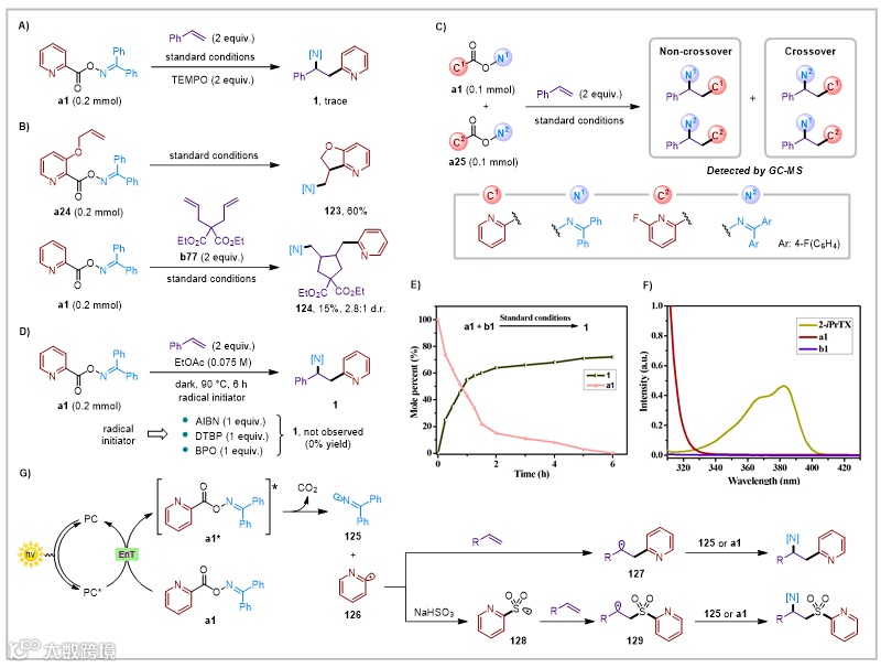 与苯乙烯的光化学反应被完全抑制(图6A),表明反应可能涉及自由基历程。此外,通过分子内环化实验和分子间环化实验证明了吡啶自由基和氮自由基的参与(图6B)。随后,在肟酯