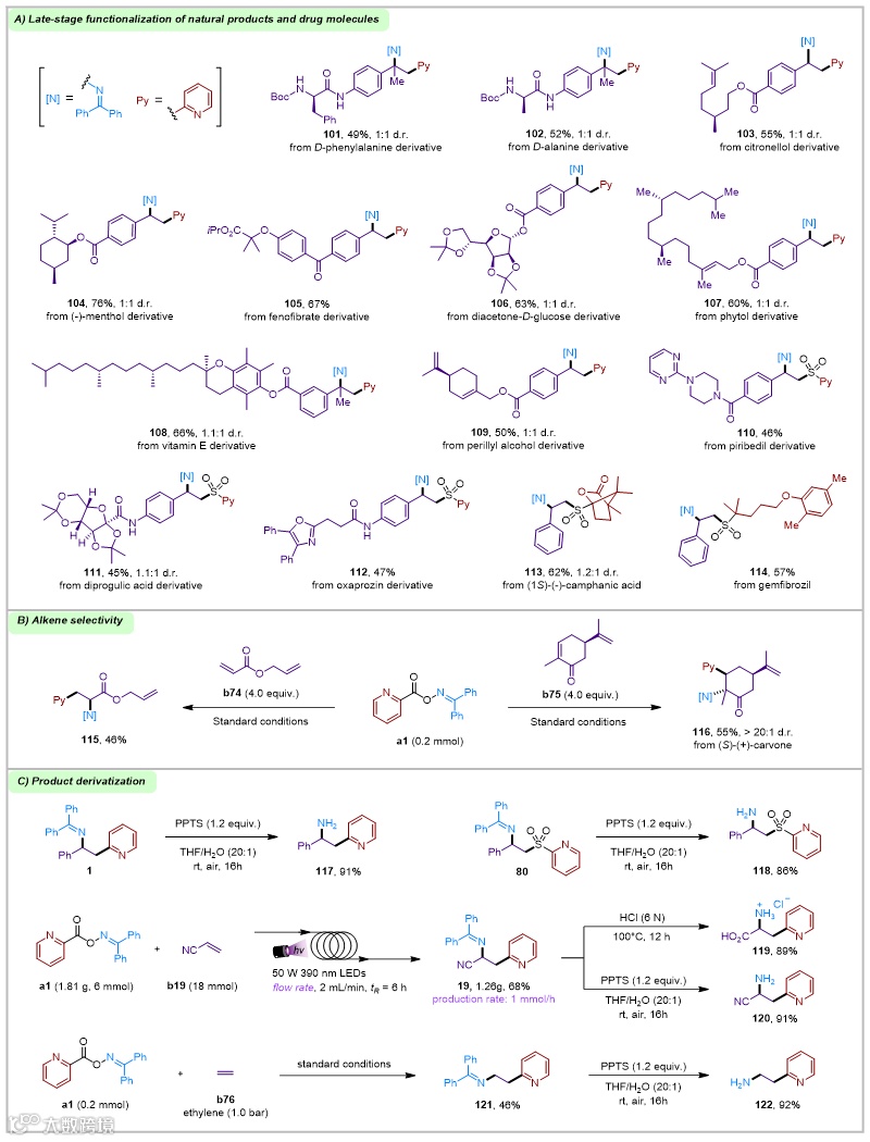 与一系列复杂的烯烃底物构建β-(杂)芳基乙胺衍生物,使标准光化学条件适用于多种具有生物价值的天然产物和药物的后期修饰(图5A)。