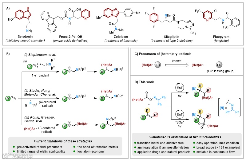 β-(杂)芳基乙胺是一类重要的结构单元,广泛存在于许多具有生物活性的天然产物和药物中,可实现多种重要功能(图1A)。近年来,可见光催化技术的发展见证了烯烃双官能团化反应的长足进步。在此框架下,几种优雅的合成策略致力于通过自由基途径发展分子间烯烃的氨基(杂)芳基化反应(图1B)。尽管这些自由基介导的转化反应具有优势,但预活化前驱体的要求、有限的烯烃适用范围和低原子经济性限制了它们的广泛应用。此外,考虑到β-(杂)芳基乙胺衍生物主要用于制药行业,在使用过渡金属作为催化剂时,必须去除产品中有毒的痕量金属污染物。因此,开发一种无金属参与、可持续的反应策略实现烯烃的氨基(杂)芳基化反应是非常理想的。