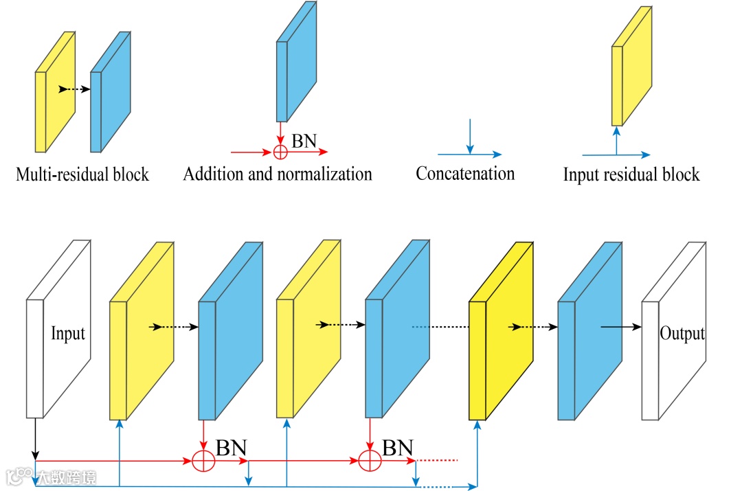 图1. AC-ResNet的网络结构。红色箭头表示特征图相加(Addition),将网络的输入层(Input)和之前所有多残块(Multi-residual block)的输出层相加。BN表示批量归一化层(Batch normalization)。蓝色箭头表示通道连接(Concatenation),将网络的输入层和之前所有特征图相加后的BN层通道连接在一起。通道连接的结果是下一个多残差块的输入。