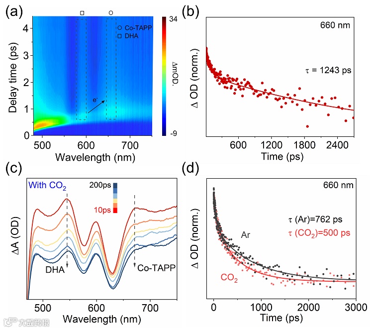 条件下进行的fs-TA光谱进一步表明在光照下DHA分子上的电子被激发并转移到Co-TAPP上,同时,Co-TAPP在Ar和C