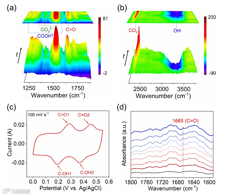可以参与CDRR,且这一过程伴随着C-OH到C=O的转化。同时,出现的一系列中间体吸收峰进一步证明了CDRR过程的发生(图3a-b)。此外,循环伏安曲线显示出的0.28/0.19 V和0.46/0.37 V氧化还原电对可归属于C=O到C-OH基团的转化(图3c-d)。