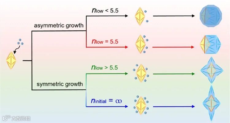 ,就可以通过孪晶晶界增生得到Pd-Au两面神二十面体,或通过孪晶晶界延伸得到Pd@Au核壳纳米星。机理研究表明,注射速度决定了稳态下