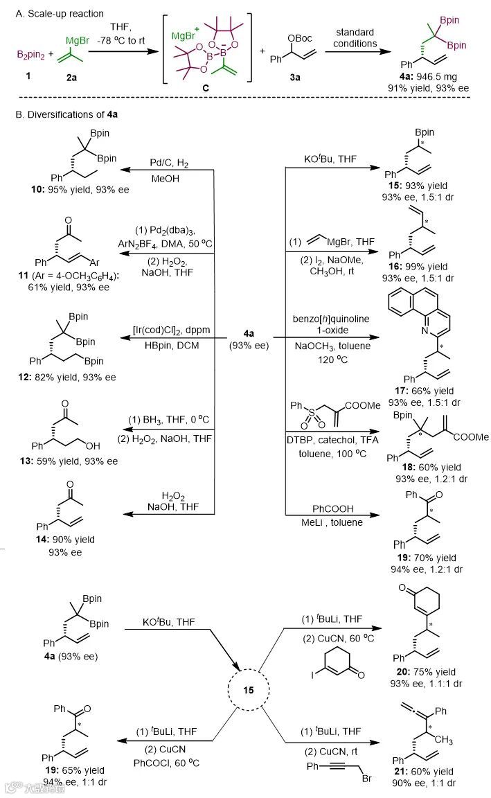 综上所述,作者发展了1,2-硼迁移介导的金属铱催化烯丙基取代反应,高效合成了手性的含有季碳中心的偕二硼酸酯。在该反应中,作者发现温度对立体选择性控制的“反常”效应,即通过升高温度实现反应优异的对映选择性控制。与此同时,作者利用计算化学等手段揭示了反应历经动态动力学拆分和对映选择性的起源问题。通过该方法制备的偕二硼酸酯产物可以作为平台分子,实现多样性化学转化。