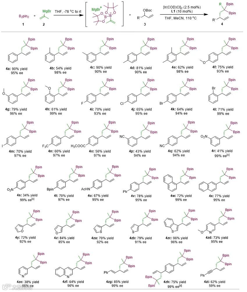 1, 2-硼迁移介导的金属铱催化烯丙基取代反应,高效合成了一系列含手性砌块的偕二硼酸酯