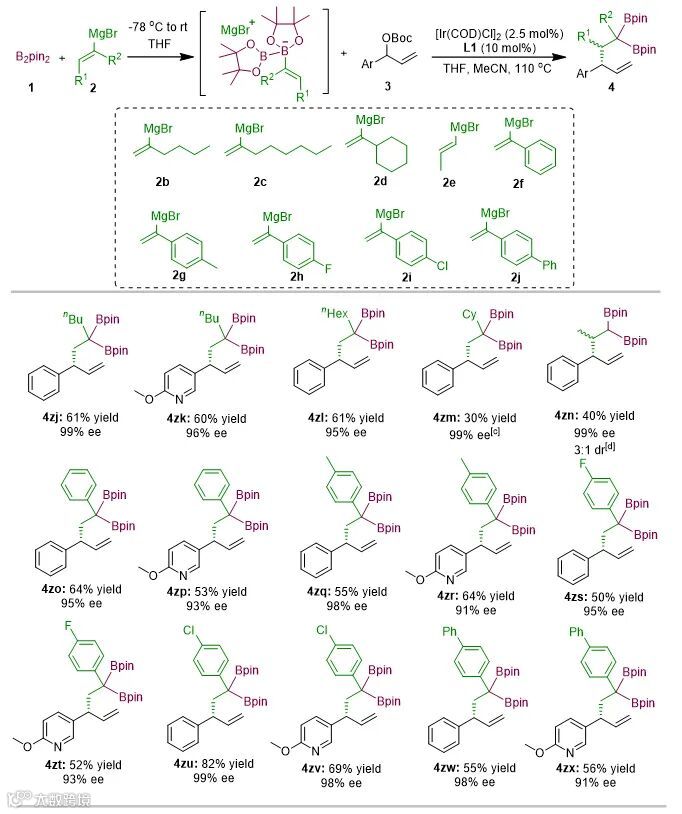 接下来,作者还考察了一系列乙烯基格氏试剂的底物范围(图4),发现链状和环状烷基和芳基取代的乙烯基格氏试剂均能取得不错的收率和优秀的对映选择性。