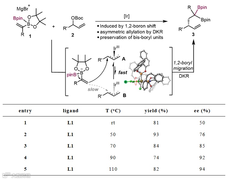 图2. 1,2-硼迁移介导的金属铱催化不对称烯丙基取代反应及温度效应实验