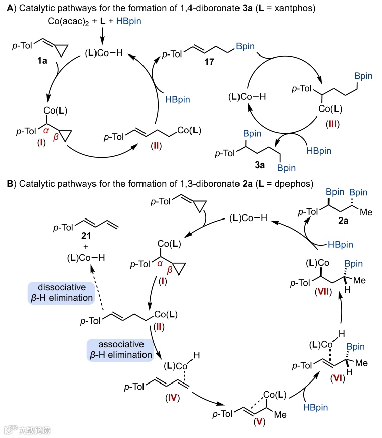 。随后发生分子内钴-氢插入得到C-Co键与C-Bpin键呈优势反式构象的中间体