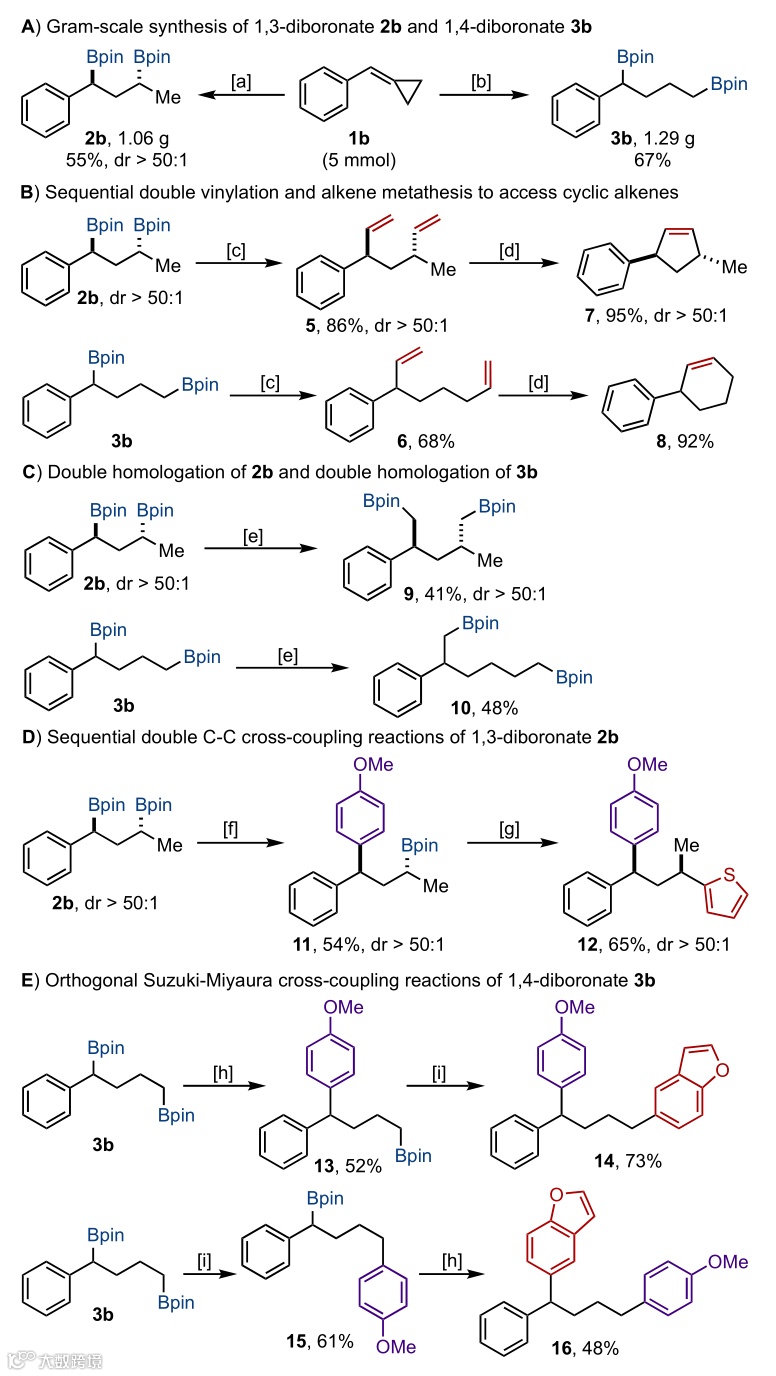 在最优的反应条件下,作者进行了放大量实验,实验发现,反应具有良好的分离产率及优秀的区域选择性。另外,作者也分别对1,3-二硼酸酯产物