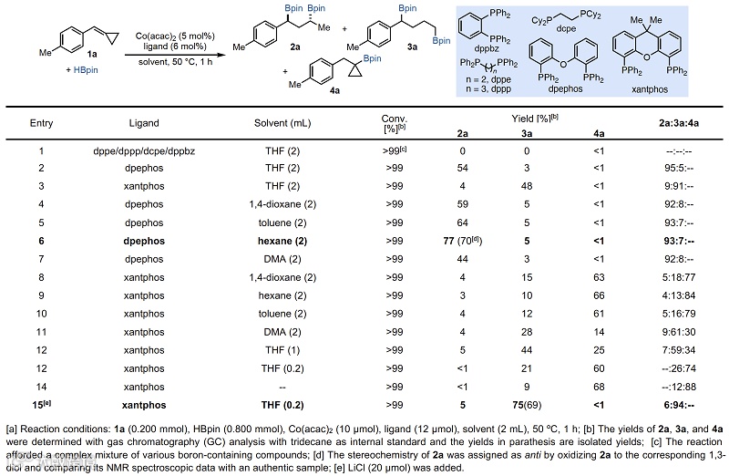 导读:新加坡国立大学葛少中课题组设想能否进一步发展廉价过渡金属(如钴)催化过程中加入硼烷,通过配体调控选择性来实现亚甲基环丙烷的开环双硼氢化反应。