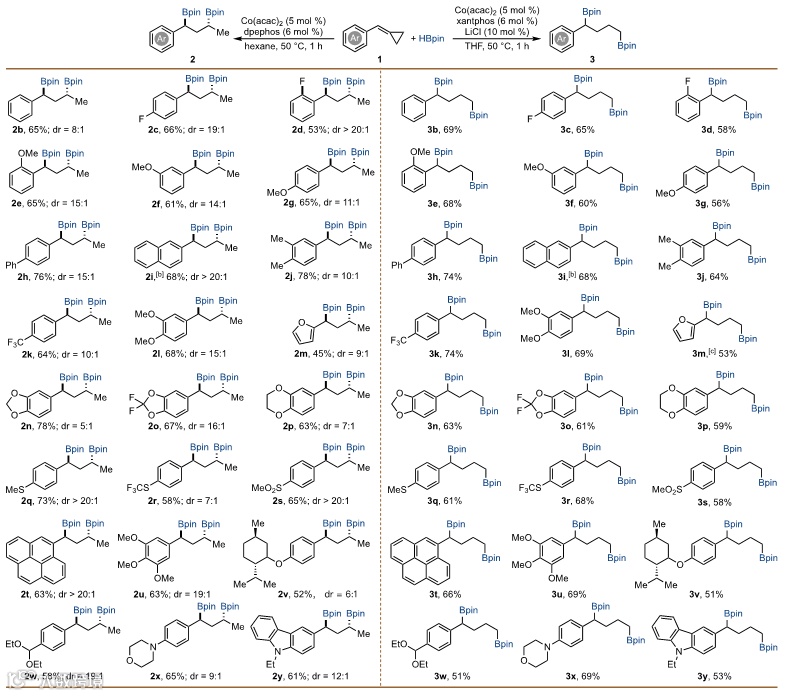 在最优反应条件下,作者探索了反应的底物范围。一系列亚甲基环丙烷的芳环上取代基进行考察,无论吸电子、给电子芳基或杂环,都能以良好的收率,高选择性分别得到1,3-和1,4-二硼目标产物,反应中底物官能团兼容性也很好。值得指出的是,在最优反应条件下得到的1,3-二硼产物都具有优秀的dr值。