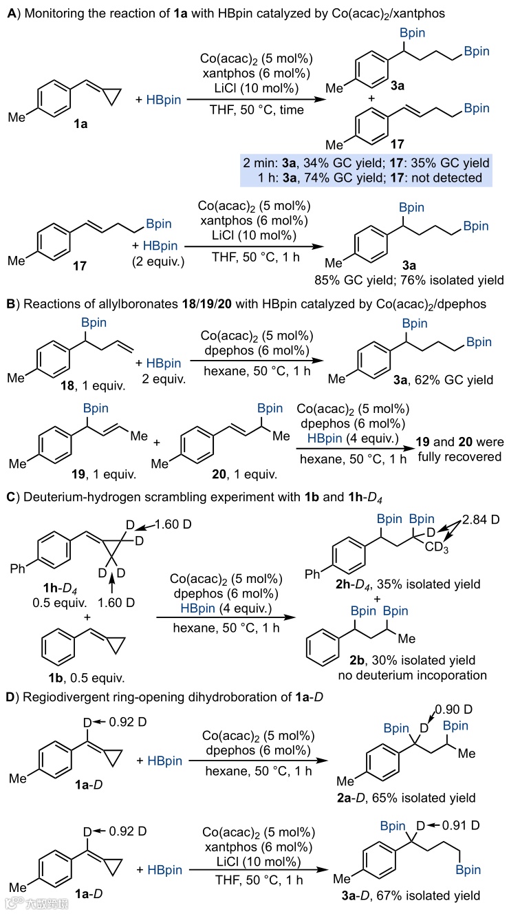 与xantphos催化体系下验证实验;合成的苄基单硼酸酯可能中间体与HBpin在Co(acac