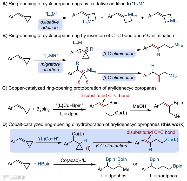 发展廉价过渡金属(如钴)催化过程中加入硼烷,通过配体调控选择性来实现亚甲基环丙烷的开环双硼氢化反应。
