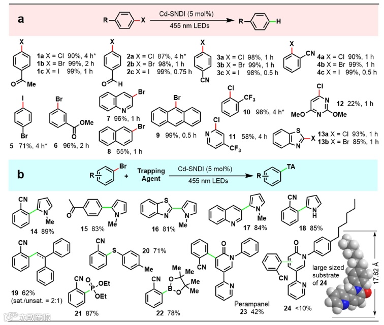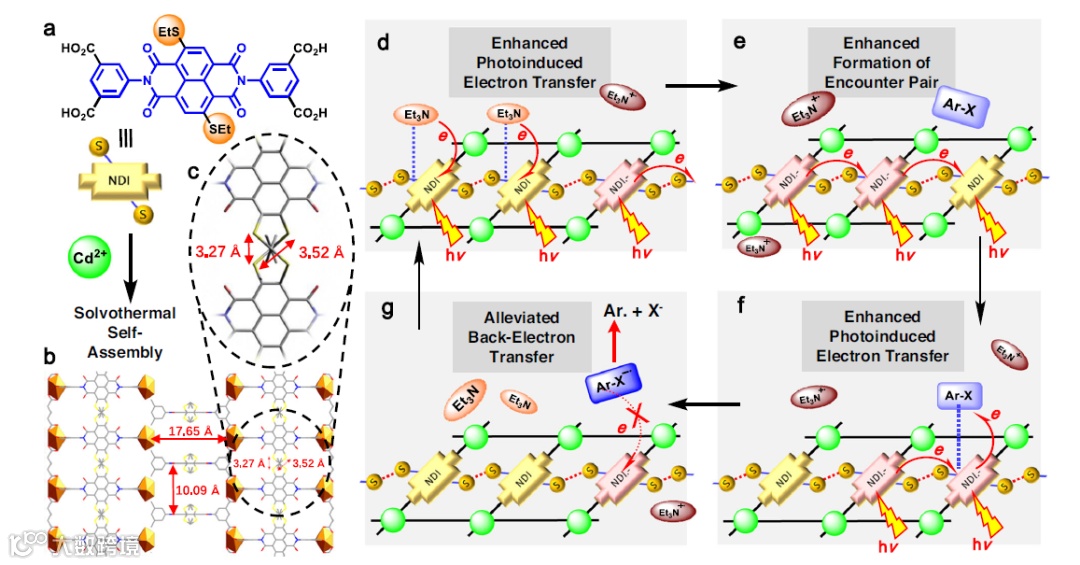 不同于传统的热致反应和过渡金属催化反应,光催化为有机合成和精细化工中间体转化提供了更加绿色清洁的驱动力,光致电子转移为惰性化学键提供了单电子活化的路径;然而,单次光子激发的光催化受制于单个光子的能量上限,难以满足惰性化学键活化对极端氧化还原电势的需求。相较于常见的闭壳层光敏剂的直接激发,染料光敏剂的开壳层自由基离子态在受激后能够达到更加极端的氧化还原电势;但是,其激发态寿命通常在几十至几百皮秒量级,显著小于溶液相反应扩散控制下、激发态物种和底物相遇所需的时间尺度,在催化剂-底物遭遇对形成之前即会湮灭,类似于“强弩之末势不能穿鲁缟”;因此,在电子/空穴供体的存在下,从闭壳层光敏剂出发,经过两次激发的连续光致电子转移过程(consecutive photoinduced electron transfer),虽然可以得到优势的热力学驱动力,但是在反应动力学层面却是不利的。如何提升极短寿命光激发态物种对于底物的可及性,是调控双光子连续光催化反应性的关键科学问题,也对开发实用化的惰性化学键活化技术提出了挑战。
