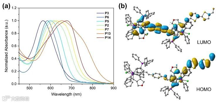 具有宽而强的吸收,其吸收边带可延伸至近红外NIR区。这是由于给体(联噻吩)和受体(双碳龙)之间强烈的分子内电荷转移相互作用ICT引起的。利用DFT理论计算对聚碳龙