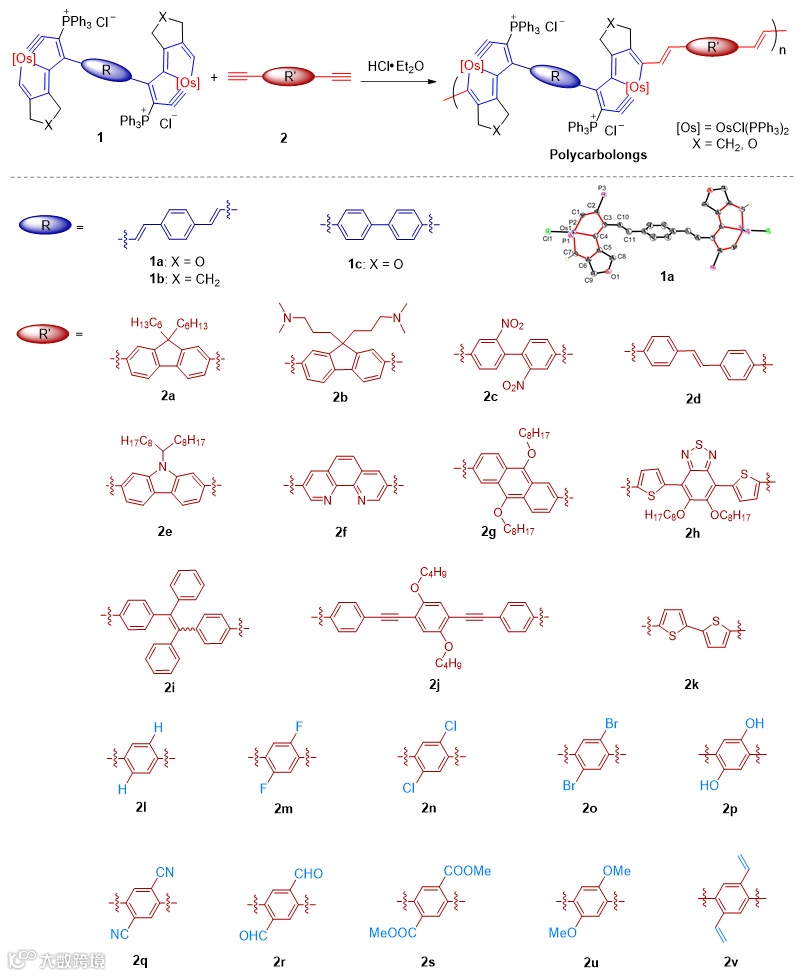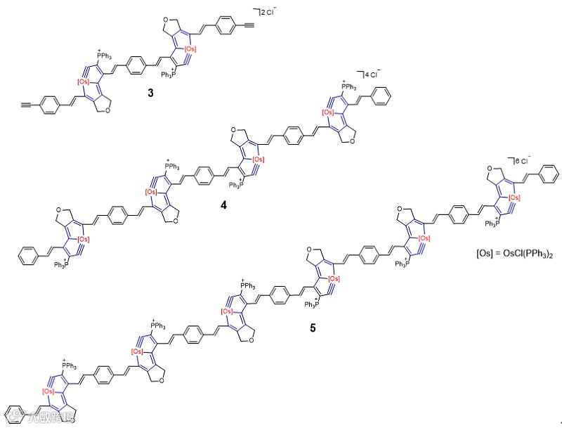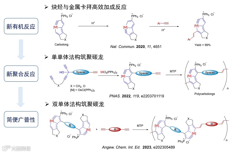 协同促进下,炔烃对锇卡拜的亲电加成反应。该反应具有高效(近100%转化率)、专一(没有副反应)、官能团容忍性好(常见官能团都能耐受)、条件温和(常温、常压;空气氛下;溶剂不用处理直接使用)、区域及立体选择性专一(反马氏加成、反式烯烃产物)等优点。利用这个反应,可将有机芳香体系与金属杂芳香体系相连接。更为重要的是,这类关于金属-碳三键和碳-碳三键的高效反应满足了聚合反应开发的必要条件。