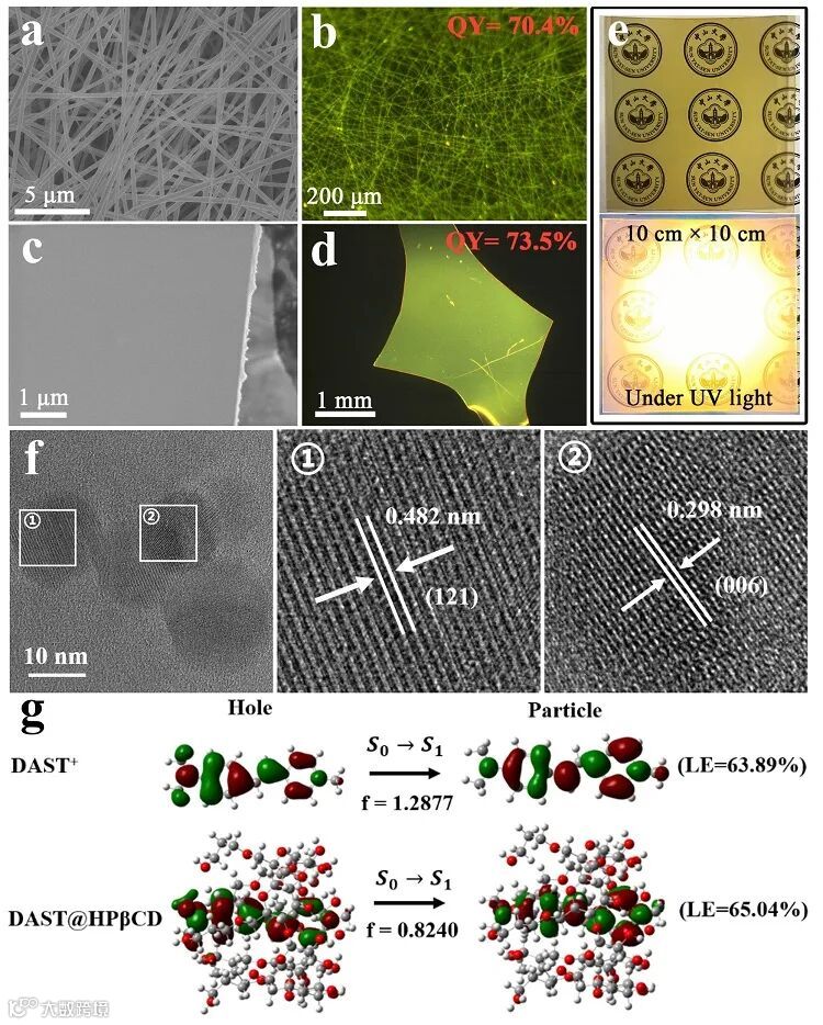 图2. DAST@HPβCD纤维/膜的形貌表征以及NTO模拟计算