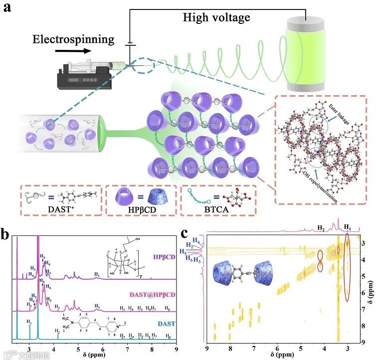 图1. (a) 静电纺丝制备DAST@HPβCD纤维的工艺示意图。(b) DAST、HPβCD和DAST@HPβCD的