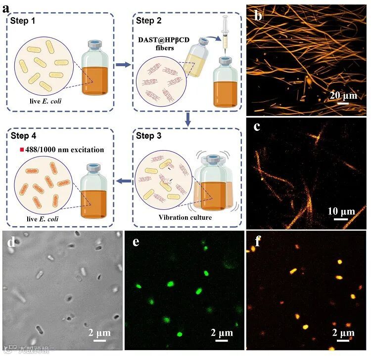 上述特性可使DAST@HPβCD超分子薄膜满足在体内生物成像的应用要求。对此,作者应用DAST@HPβCD纤维作为大肠杆菌的活体染色剂,在1000纳米的近红外(NIR)光激发下,成功实现了实时的大肠杆菌(