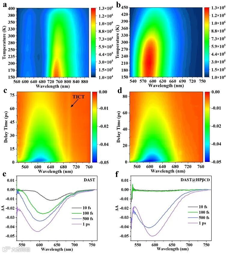 研究发现通过交联HPβCD超分子网络,可以持久固定DAST分子的非中心对称排列结构,这使得DAST@HPβCD超分子薄膜无论在固态还是溶液状态下都具有优异的非线性光学(NLO)性能。由于HPβCD包合物有效的空间限域作用,限制了DAST分子的分子间运动,激发态主要被限制在LE态,而TICT等