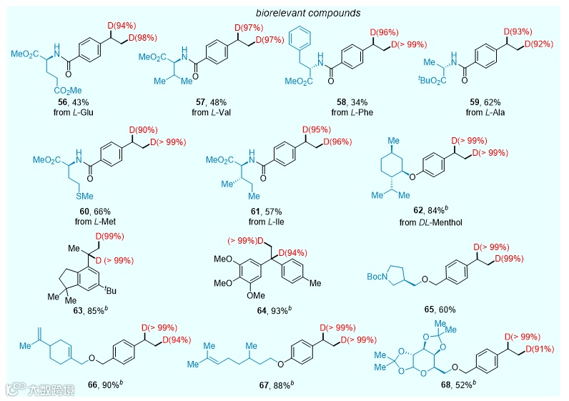 -氘代芳基化合物。另外不同的1,3-丁二烯也能够兼容该方法,得到1,4-氘代的芳基丁烷类化合物(图4)。此外,对于氨基酸、糖、以及生物活性相关化合物的后修饰也有良好的反应效率(图5)。