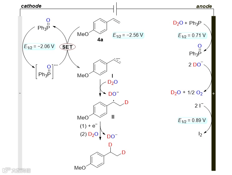 在该反应中,作者通过使用TPP作为媒介,首先在阳极氧化,与水生成三苯基氧膦(TPPO),TPPO在阴极发生单电子还原,得到TPPO负离子自由基与底物发生SET过程生成苯乙烯负离子自由基I,之后负离子被重水捕获得到稳定的苄位自由基物种II,II继续发生单电子还原并被重水捕获生成最终产物(图3)。