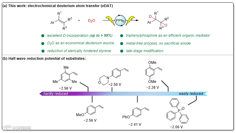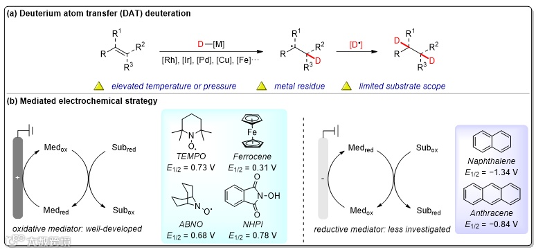 具有氘原子(D)标记的化合物在药物化学以及有机化学反应机理研究等领域发挥着非常重要的作用。通过氘原子转移(Deuterium atom transfer, DAT)策略对烯烃进行氘化是选择性合成氘代化合物的重要策略之一。作为代表,烯烃的氘化反应一直是一个重要的研究方向。传统方法通常使用过渡金属作为催化剂,使用氘气作为氘源,而且通常需要高温高压的反应条件,在实际应用中带来诸多不便,并且存在着金属残留物等问题,而在药物化学中,对金属残留物的量具有非常严苛的要求,痕量的金属残留物在后处理的过程中往往需要非常高的成本(图1a)。因此,发展绿色、高效的非金属催化的烯烃氘化是非常有必要的。近年来,有机电化学合成实现了飞速发展,通过电化学实现缺电子苯乙烯的还原氘化也已有报道。然而,电化学方法目前主要受限于缺电子苯乙烯类化合物,底物范围具有一定的局限性。原因在于富电子的苯乙烯类化合物具有较高的还原电势和较低的氧化电势,难以在阴极发生还原且官能团耐受性较差,并容易在阳极发生氧化生成不必要的副产物等。相较于直接电解(Direct Electrolysis),