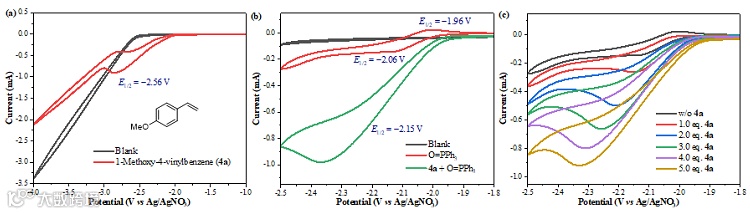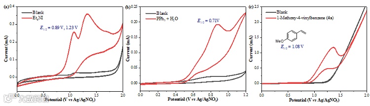 与TPPO之间的电子转移作用(图6c)。此外,作者还对该反应体系的氧化电势进行了测试。电解质四乙基碘化铵(