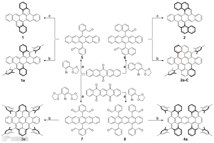 合成策略上主要通过锂化试剂对相应的并五苯酮前体进行亲核取代反应以及还原芳构化合成一系列全新的并五苯醛基衍生物。随后,作者采用Friedel-Crafts环化策略通过并五苯醛基衍生物构筑了带均三甲苯取代基和不带取代基的系列新型扭曲多环芳烃。