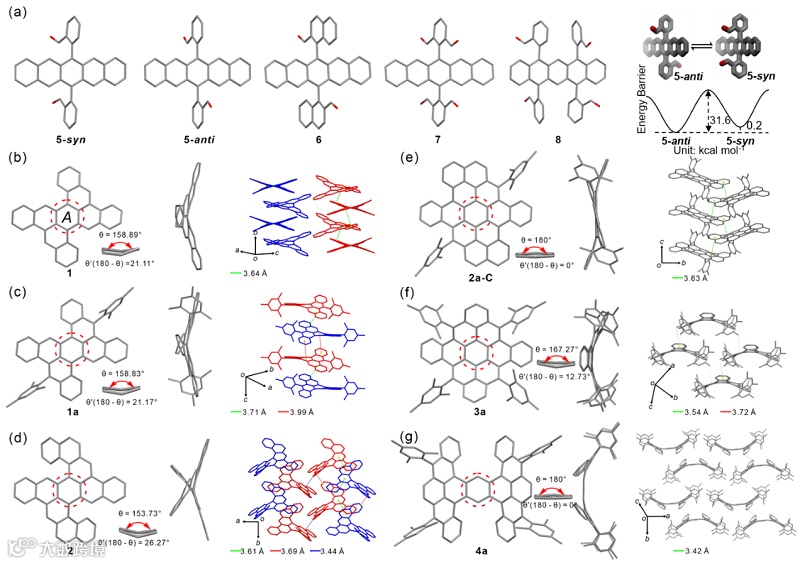 所有新合成的并五苯醛基衍生物和扭曲多环芳烃的结构都通过单晶X射线衍射研究得到了确定,研究结果发现扭曲构象对多环芳烃的电子结构、芳香性、光物理及电化学性质有着显著的影响。