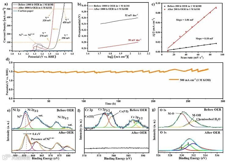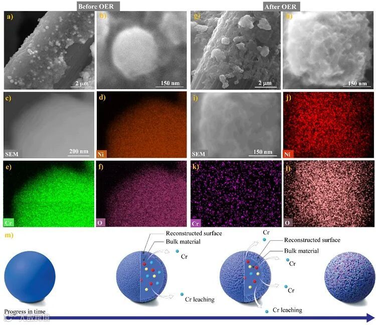 催化剂OER稳定性的显着提高归因于 Cr 的浸出和重新分布。这种动态重构机制增加了催化剂的孔隙率和电化学活性面积,并实现了更深的电解质渗透。