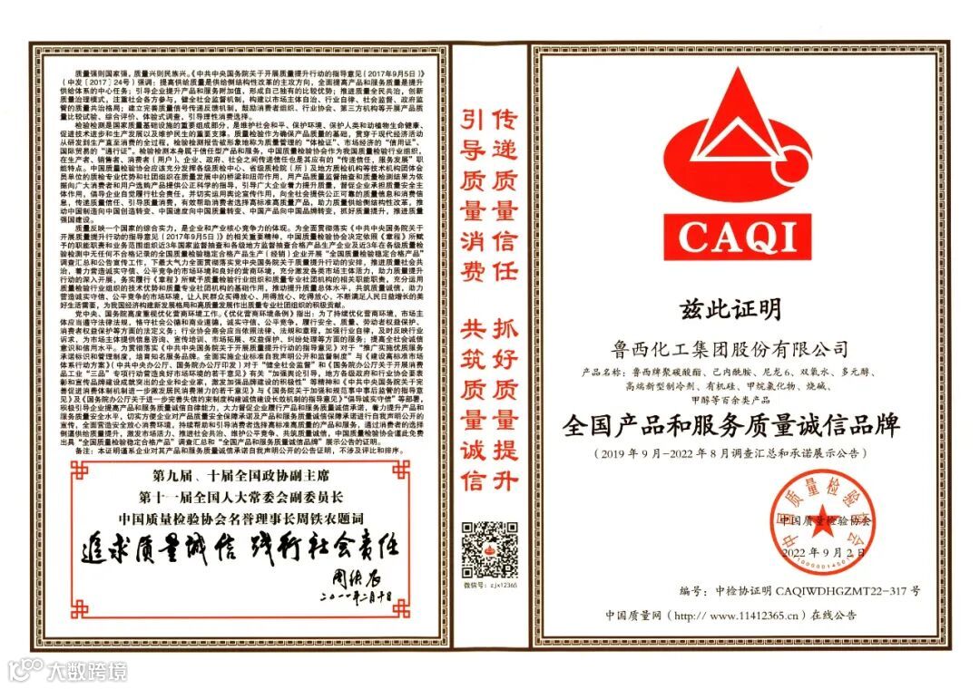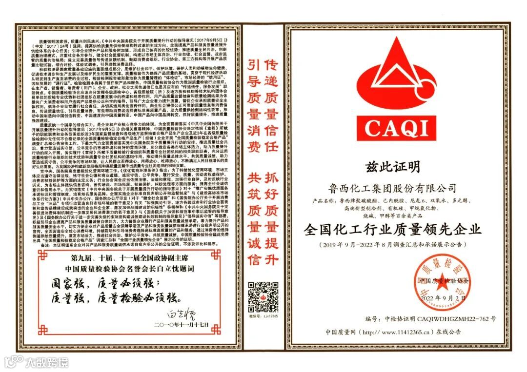 近日,在中国质量检验协会组织的2022年全国“质量月”企业质量诚信倡议专题活动中,鲁西化工集团股份有限公司被授予“全国质量诚信标杆企业”称号,并在《中国质量网》、《中国经济网-质量经济频道》《中国产品质量信誉网》等官方媒体平台进行了宣传展示。