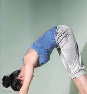 动作描述:站立,双手手指交叉握住往前推,弓背往后推,放松头部,眼睛看着腹部。