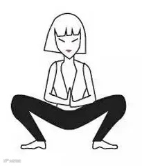 动作描述:分腿站着,慢慢下蹲,直到完全蹲下,脚后跟落稳后,手合掌放在膝盖内侧,深吸一口气,呼气时,手推膝盖往外,挺胸,脊柱往上带,臀部主动地往下往前推。