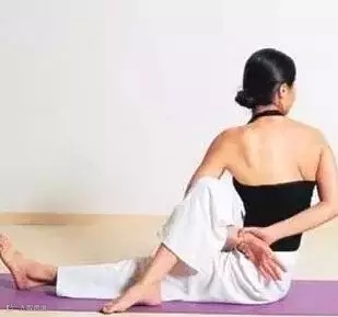 动作描述:坐稳,保持直背,左腿跨过右腿踩住地面,右手肘或大臂放在左腿外侧,手和腿往中间同时用力,身体充分左转,扭转脊柱,伸展腰部。左边做完换右边。