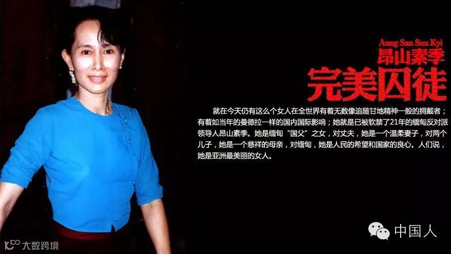 昂山素季生于1945年,是缅甸以非暴力形式倡导民主的政治家,也是缅甸最大反对党“全国民主联盟”总书记。昂山素季的父亲德钦昂山是缅甸反英、抗日、争取国家独立的“国父”。德钦昂山出生在缅甸马圭县那卯镇一个佛教家庭。1939年8月15日,德钦昂山在共产国际和中共帮助下秘密成立缅甸共产党,并出任缅共总书记。