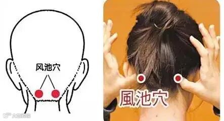 先用右手拇食指岔开,分按两侧风池,两指同时用力一捏一松25下;换左手捏拿风池25下。