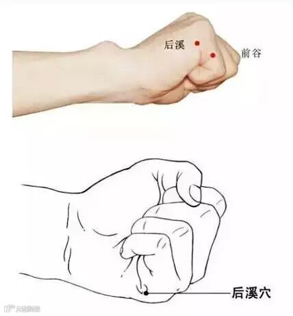 两手握拳,拳心朝上,两后溪对敲50下。针5~8分。