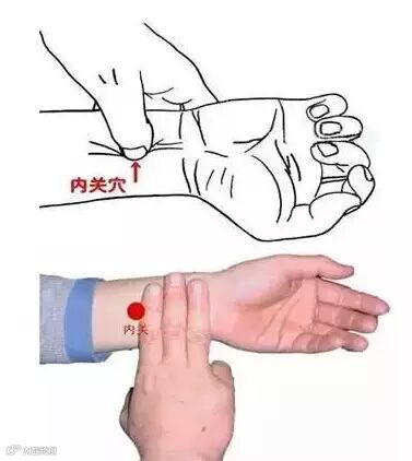 用右拇指按压捻揉左手内关50下;换左手拇指捻揉右手内关50下。