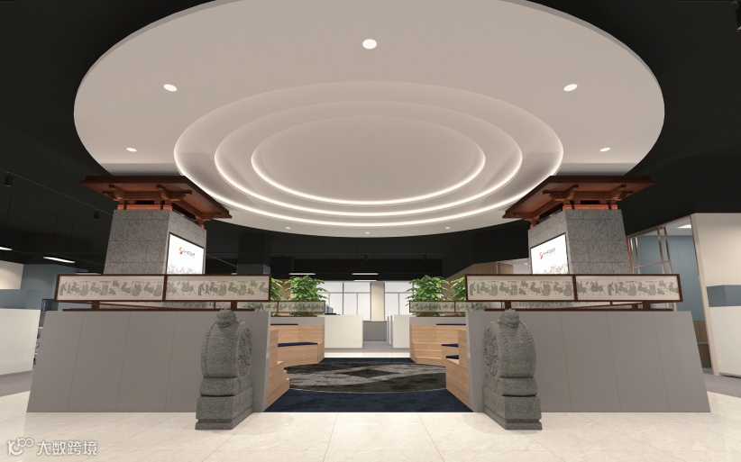 复大复为项目组为徐州农商银行以“汉文化”为主题进行了空间打造,在设计理念上充分吸收了两汉文化中“天圆地方”的思想,在视觉呈现上随处可见的车马图、古城墙造型等,仿佛历史照进现实,让客户精神上震撼、情感上亲近。