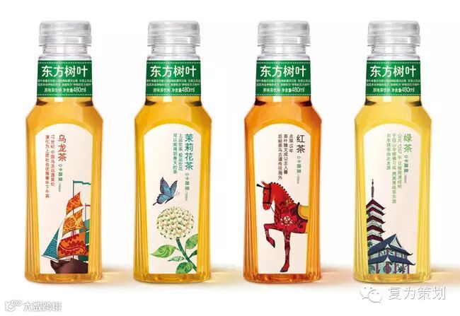 农夫山泉推出了系列茶饮料,叫“东方树叶”。这里我对它的上市战略不做评价,只是从包装设计系列化的角度给大家讲“规范色的分歧性”问题。